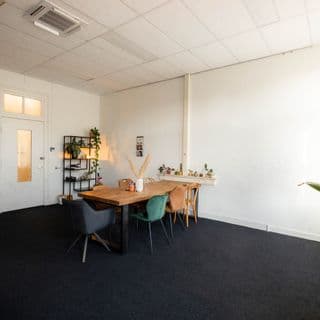 Een ruime tafel, perfect voor vergaderingen, workshops of creatieve sessies met maximaal 8 personen.